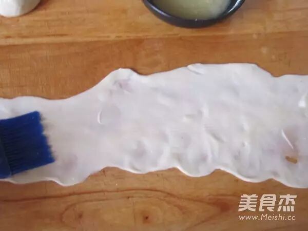 9.将饧好的面团在沾有油的案板擀成一头大些的薄皮,长度可以尽量长些,将刚才和好的酥油面用刷子均匀抹在面皮上,再撒些盐和黑胡椒碎