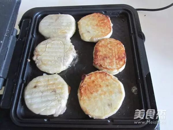6. 预热电饼铛,上下刷成油,放入面饼,按下功能键,中间翻动一次,将它们煎至两面金黄