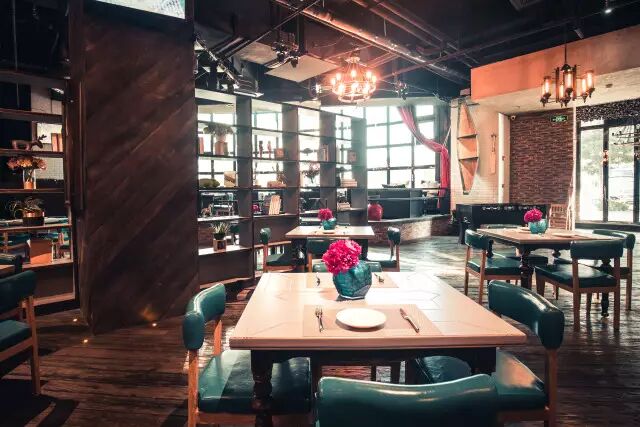 工业风和欧式后现代的装修风格,垂吊的灯饰,按照酒吧标准复制的高脚孔雀蓝牛皮沙发,粗犷的木地板,强烈的撞色对比,一切细节都分离了整个餐厅的厚重感,更多了一份轻快和舒适。