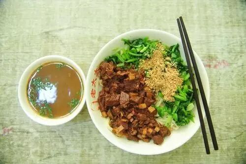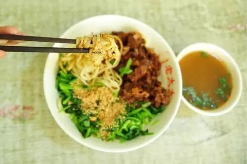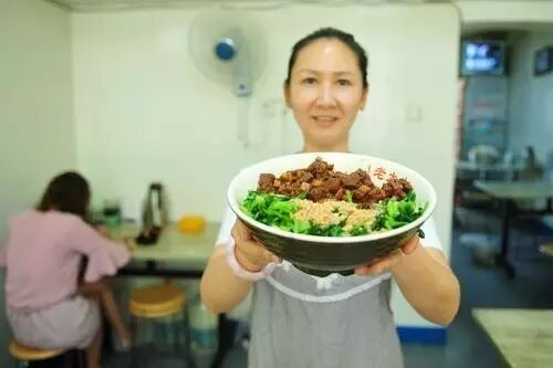 看上去也只是简单的配搭,为何能招惹来这么多食客?记者点了一个小份牛丁干拌,服务员仔细询问对辣味的接受程度,上餐时也不忘温馨提示:“拌匀再吃。”经过一番搅拌,指肚大小的酱褐色牛肉丁、深黄色的鸡腿菇丁、油绿的水焯青菜均匀地点缀在一股股手擀面条间,浓香的干花生碎也随着汤汁裹在了每一根面条上。