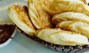 保定传统特色小吃,始于清末。外型美观,口感香、酥、脆,不走型,易保存。制作过程:首先是和面,根据季节和水温的不同,和成六成面,饧发一小时左右,手感柔软有弹性即可,然后将面擀成片,抹上五香料、麻酱及适量香油,再将其甩开、抻匀,卷起来,做成二两一个的坯子,上铛烙至两面微黄,上烤炉烤,至颜色金黄、呈小气蛤蟆状出炉,最后,将烤好的烧饼晾凉,从一侧用刀切开,用小竹板把烧饼瓤一层层拨开,上油锅炸,先用温火使其定型,待内外炸透、炸酥、成酱红色出锅,晾凉即可吃。