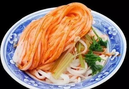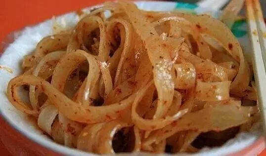 这一碗是在陕西关中一代流行的凉皮。制作方式是先把面粉和面,在水中搓洗,清洗出面筋,再用洗好的粉浆上笼蒸制而成。 “辣子多醋多”是食客们最常给凉皮店老板说的一句话。
