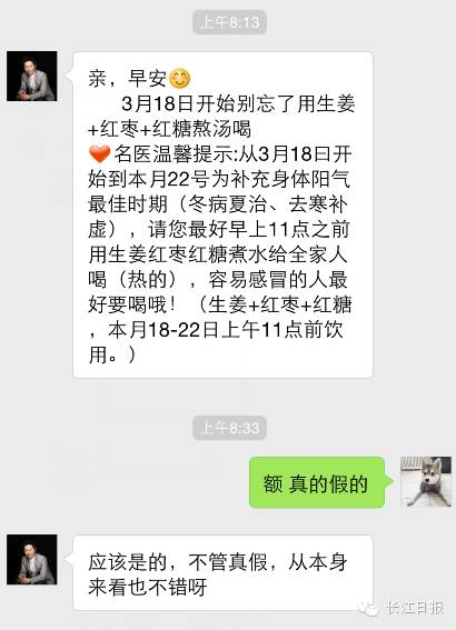 最近朋友圈被这个养生秘方刷屏了……收到朋友发来“秘方”的周先生立马转发给了其他朋友,“因为生姜、红枣、红糖这三样食材,平时大家常吃,也觉得健康,不管真假,试试也不错”。