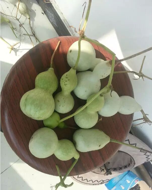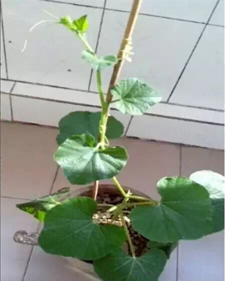 如果培养土壤中不含肥料,一盆要参杂50克左右的水溶肥或者100克有机肥作为底肥。盆栽葫芦非常容易干燥,在蔓刚开始蔓延时一日要浇一回水。在盛夏高温季节,一日要浇两回水。在花盆上支四根支柱使其固定,高出花盆表面50㎝,并做成90度的网格状棚架。在母蔓长到4—5叶时掐蔓,留下2个子蔓,使其向上蔓延。子蔓爬上棚顶时要掐蔓,并使其2个孙蔓向上延伸。待孙蔓长到5个枝叶时开始掐尖,使果子从孙蔓长出曾孙蔓上结出。让蔓任意生长,等其长出棚外时掐掉。果胜到5—6个时要追肥一次,这很重要。当然,搭架子可以就地取材,不一定非要这么搭架子,各位朋友可以充分发挥自己的想象力,阳台的护栏,防盗窗都可以让葫芦爬上去。