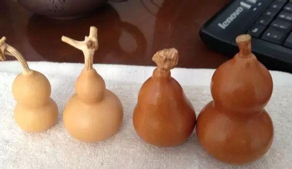 用左边的新葫芦来比较一下就可以明显的看出,左1左2是我刚淘的,左2晒了几天,但看着颜色比左1好多了。(咳咳 这四个是从老金哥那搞的 我每次晒之前先在脸上蹭蹭,在用棉手套轻轻的擦一下)所以可见晒对葫芦来说是很重要的。