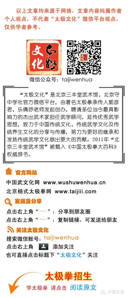 杨澄甫式太极拳产生以后,什么是杨澄甫式太极魂成为影响其发展的一大关键,同时也是拳友们时常谈论的热门话题:有的说是“掤”,有的说是“松”,凡此种种莫衷一是。我则认为杨澄甫式太极拳之魂应该是“圆”和“圆转运动”。因为只有它,才能对杨澄甫式太极拳起主宰作用,只有它才是杨澄甫式太极拳的生命来源,只有它方可表现杨澄甫式太极拳的活力。事实胜于雄辩。我们试将千斤重的石球置于一平面上,用很小的力即可使其动起来。从状态上看,石球围绕自己的中轴做匀速自转和公转运动;从方向上看,外力向东,石球自转的方向则朝西。可谓“四两拨千斤,动中有静,动静合一,你来我往”;又如不倒翁,只要我们轻轻一按,它就立即随着按手的方向“走化”,按手慢慢回收,它就紧贴按手还原,“不顶不丢”,“舍已从人”,永远不倒;再如水上漂葫芦,如果我们不经意地对葫芦轻轻点按时,葫芦就会很敏捷地滑到一边,即使合按其中心点,力的方向只能是垂直,一旦打曲,合不住其中心点,葫芦便会猛地反弹起来,而且按力越大反弹力就越大。这不又一次反映了“一羽不能加,蝇虫不能落,人不知我,我独知人,随曲就伸,动急则急应,动缓则缓随”的太极拳“神明”境界吗?