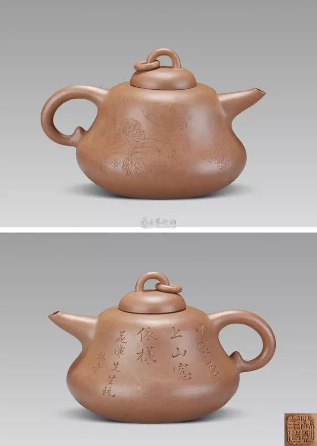 为官清廉,两袖清风的曼生,亲戚多清贫。一日,远房外甥来访,以一担青葫芦为礼,“区区葫芦,送福送禄,恭贺亲舅福禄双获”。曼生款待之。甥别,信手拎置于案头,越觉有趣,置笔墨,依葫芦作紫砂壶样,并置套环壶钮取“福禄双获”之意,名“套环钮葫芦壶”。