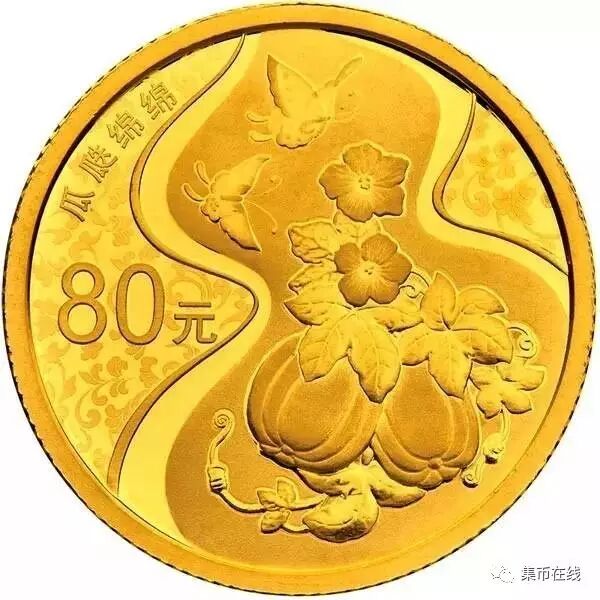 “瓜瓞绵绵”一词出自《诗经•大雅•绵》,其曰“绵绵瓜瓞,民之初生,自土沮漆。”意思为一根连绵不断的藤上结了许多大大小小的瓜一样,在中国传统吉祥文化中通常指代寓意子孙繁衍不息、家族兴旺延续。“瓜瓞绵绵”金银币包括5克金币和30克银币,背面图案均为瓜、藤蔓、蝴蝶以及葫芦图形,衬以缠枝纹样组合设计,并刊“瓜瓞绵绵”字样及面额。