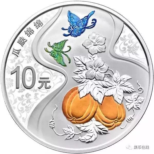葫芦谐音“护禄”或“福禄”, “瓜瓞绵绵”金银币画面就是一只大葫芦里挂满小葫芦,小葫芦里籽众多的吉祥葫芦,藤蔓青翠袅袅娜娜地垂坠相连,看似野生无状,却互相缠绕扶摇而上有着无处尽藏的生命力,硕大饱满的葫芦叶纤毫毕现,而在藤叶垂生相连之间有几只小葫芦、小瓜蔓生蔓长,一双镶金而成的大葫芦长势好果实圆润饱满又寓意着“瓜熟蒂落”的生命赞叹。“阴阳相和,化生万物,万物生生不息”,生命繁衍意识是中国吉祥文化的重要内涵之一,“瓜瓞绵绵”金银币以传统的葫芦和蝴蝶组合来表现生命意识,以幻彩工艺和镶金工艺的组合,来重构吉祥文化符号表现形态,将传统的追求多子多福观念中代表繁衍的符号强化,也有了更强烈的祝福味道。中国社会全面进入“二胎时代”,这套币恰逢其时。