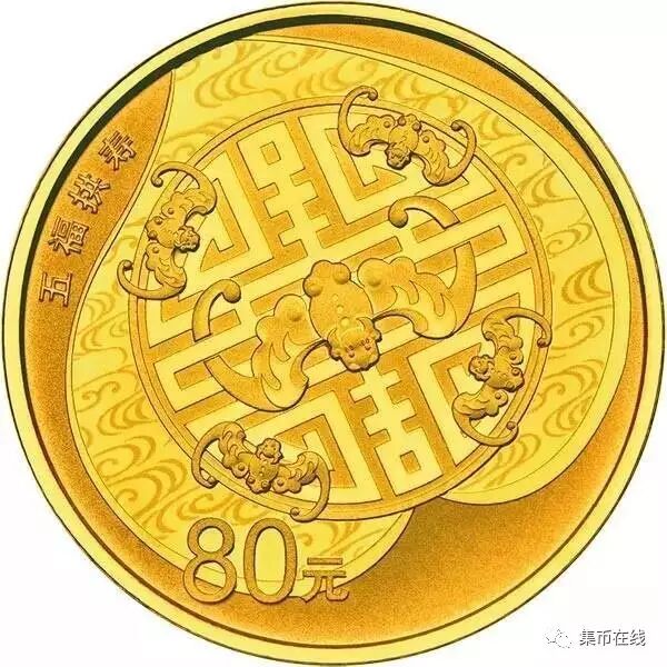 币面上,一大四小蝙蝠纹样式规整有序,形如吉祥如意,头部被塑造成类三角形,一对状似祥云的翅膀占据了蝙蝠纹的大半部分,蝙蝠的尾部则以波浪纹作为勾饰,把自然界中这种让我们觉得阴暗险涩的生物塑造得翅卷祥云、飘逸洒脱,四小蝙蝠头向里尾在外,。 似俯冲而下,带有雷霆万钧之势,配合上底景的寿字纹和装饰于四周的祥云纹。寿字纹和祥云纹形、色、量、向均一致,且和右倾蝙蝠纹保持微妙的画面平衡,产生有序、平衡的视觉美感。“五福”于天地之间,寓意寿与天齐;而它们又被裹于抽象的寿桃形之中,寓意五福拱寿,福寿无疆。