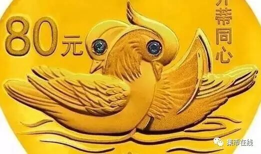 心形纪念币形制和镶嵌宝石工艺仍是保留项目,心形形制将鸳鸯并蒂巧妙地包裹起来,充分体现了东方文化设计中独特的视觉魅力;鸳鸯的眼睛以金属空心缕刻,镶嵌进了类似蓝宝石的金属块,现实中的鸳鸯眼睛并不是蓝色的,但为了画面的需要,这套金银币在设计上进行了主观意象的变色,如画龙点睛,一对戏水鸳鸯顿然“活”了起来。