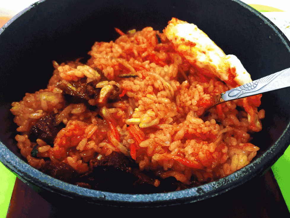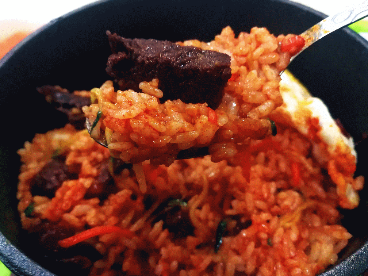 用勺子拌开米饭,蔬菜和牛肉搭配着辣酱混合在一起,简直不要太香!小编刚拌开就是一口。豆芽和牛肉简直是绝配!