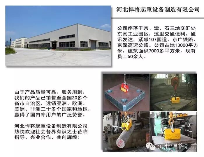 河北悍将起重设备制造有限公司是一家集研究设计制造销售于一体的现代化企业,公司主要经营永磁吸盘,电动葫芦,手拉葫芦,手扳葫芦,搬运坦克车,电动绞盘等等。