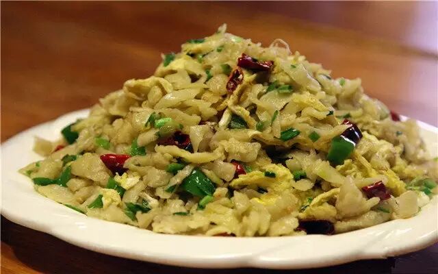 过油肉既是太原名菜,又是一道百姓家常菜。肉片肉质鲜嫩,外酥内软,搭配上蒜苔和黑木耳,十分下饭。更别提与山西特色面食结合的莜面鱼鱼过油肉、炸土豆片过油肉等变体了,更是美味。
