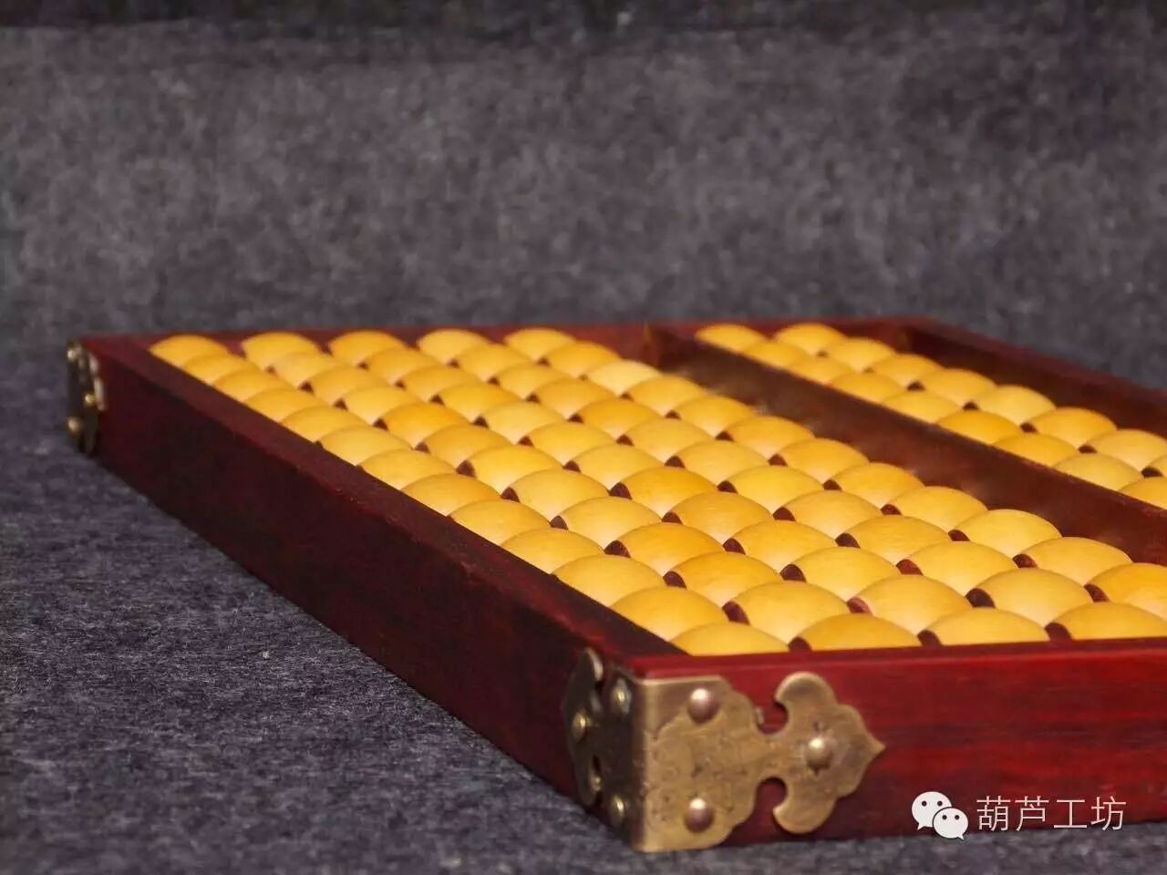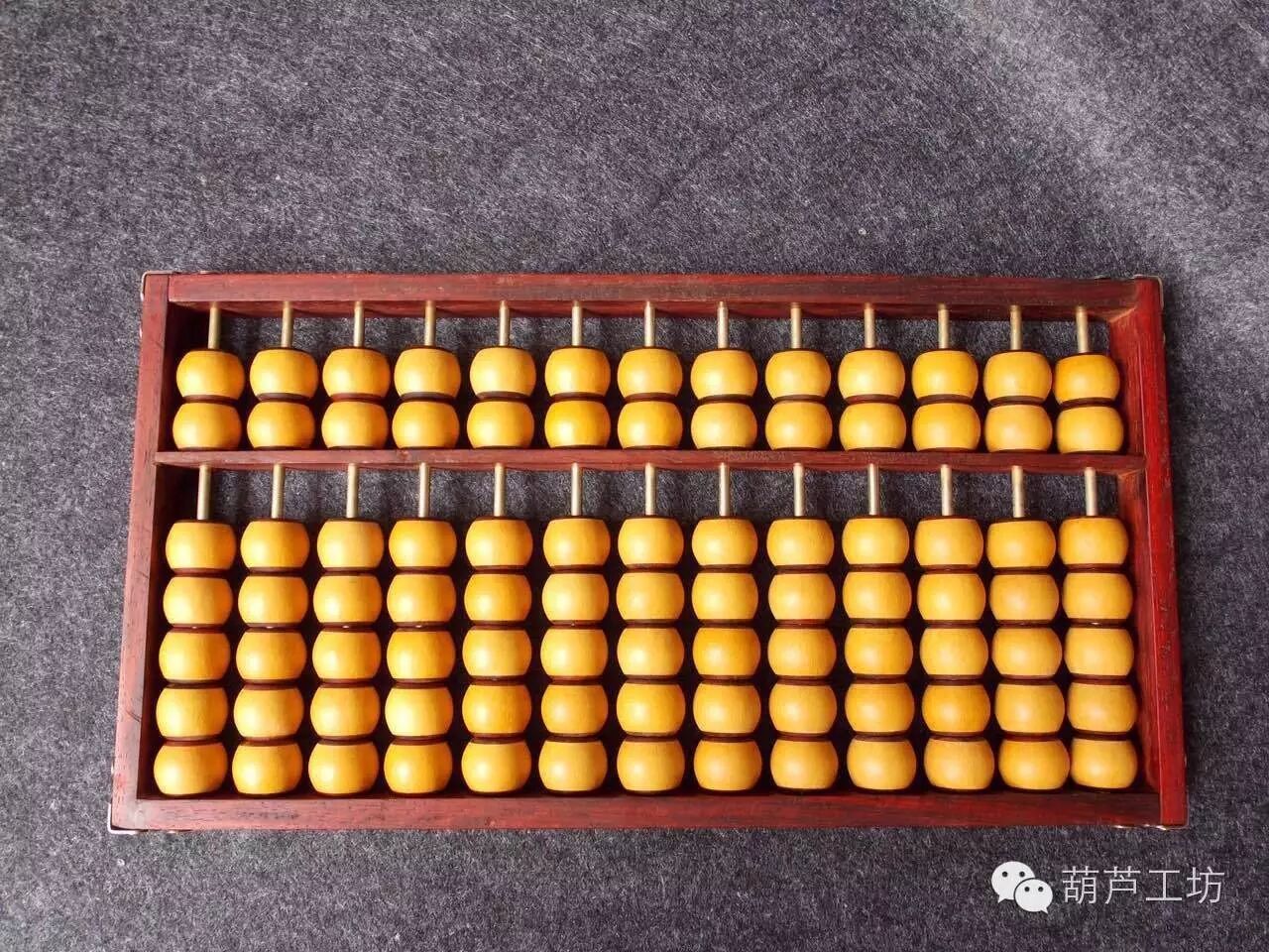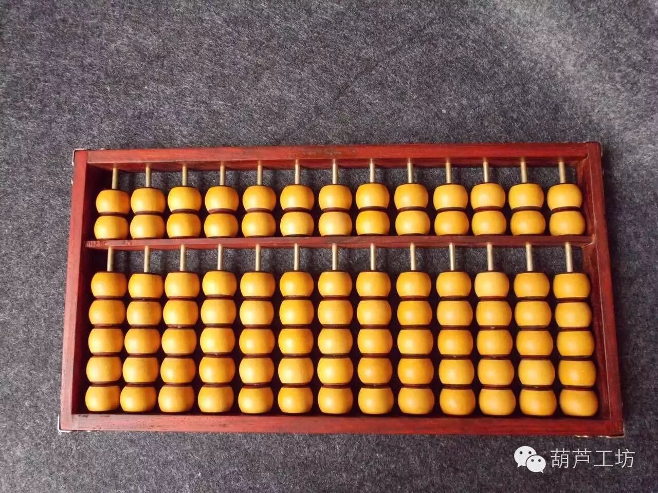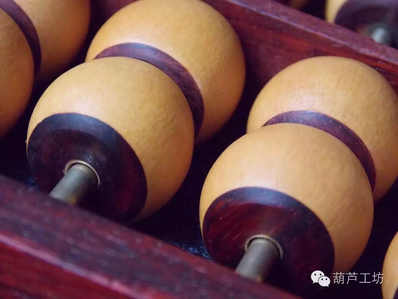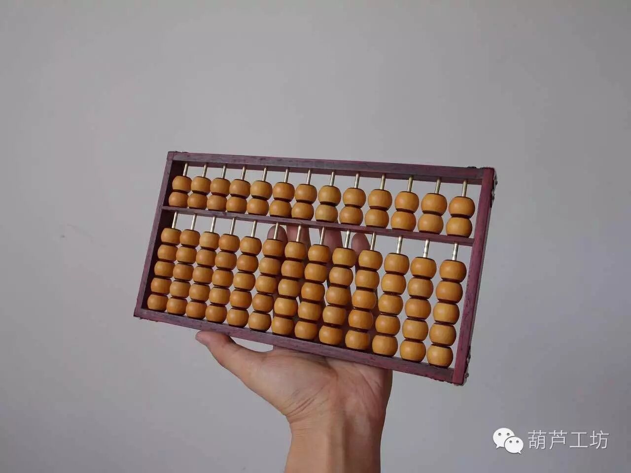 2016年春节期间,葫芦工坊总经理徐浩然率队到山西乔家大院调研山西民俗与工艺美术,在乔家大院算盘博物馆,我们看到了各种各样的算盘,于是,深受启发。在随后的几个月里,经过葫芦娃们的精心设计,终于制作出了这款“葫芦算盘”。整个算盘总共91颗葫芦珠子,葫芦珠镶嵌高贵木料,内嵌铜管。做工考究而又细致,精工细作三个月,终于完工。