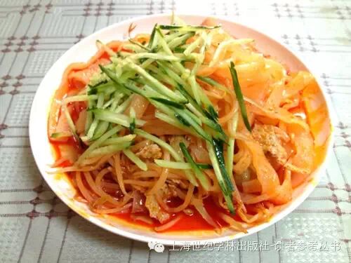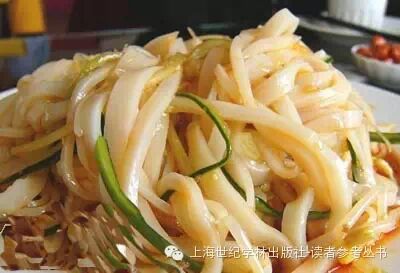 擀面皮是陕西凉皮的一种,为西府特色小吃。擀面皮的做法是把面浆放入锅中,等到面浆凝固时,用木榻榻(方形木块)揉压,再擀成薄片蒸制而成,吃起来特别筋道,曾得到清代康熙皇帝的赞赏,遂名“御京粉”。![]()