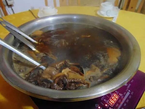 用地道的六堡茶干茶或鲜叶、茶花、茶果芯等作为辅助材料,按照传统制作方法烹调茶宴菜式,是六堡人在千百年的种茶制茶劳作过程中产生的生活智慧。以六堡茶叶入宴,不仅口感清香,更让人称道的是还能和胃健脾、消滞祛腻。譬如这一款六堡野生菌茶鸡煲,它用陈年六霜降老茶婆的茶汤作为汤水,分别加入大红菌、牛屎菌、蟾蜍菌、鸡嘴菌、姬松茸等11种名贵野生菌,再配以猪筒骨、排骨、土鸡、草龟等食材,精心熬制而成,不但味道鲜美,而且汤水茶香飘逸、甘鲜爽口、多喝不腻,还有补血、祛湿、降血脂、提高免疫力和养颜美容等功效。