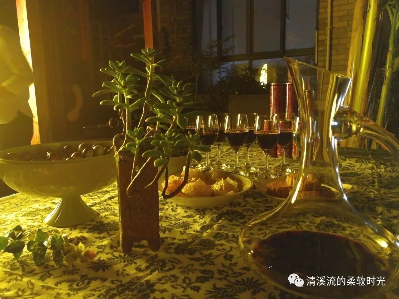 木栅栏进去,一鹅卵石小径,小径间一黄花狗迈着悠闲的八字步,好自在。两边是草坪,草坪上梧桐、芭蕉叶……秋千架、随意摆放的蒲团、五颜六色的落地灯……雅致极。当中的长桌上大枣、石榴、橘子等各色水果,月饼、蛋糕等各色甜点,醒好的红酒、调好的鸡尾酒……朦胧的夜色下温馨甚。草坪后的台矶之上,一个亲自做的圆圆的月亮,泛着朦胧黄的月亮旁垂下的柳枝条,家的味道浓透。