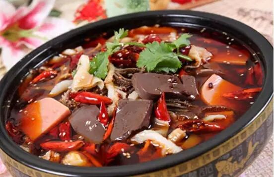 毛血旺又称冒血旺,是源于重庆磁器口,是重庆小吃,这道菜是将生血旺现烫现吃,遂取名毛血旺,毛血旺的名气已引领川菜大军,席卷了大江南北。毛血旺通常用猪血加些配料如鸭肠、泥鳅、火腿肠、午餐肉、鸭肚、猪心、豆芽等制作而成。传统的清汤口味是用罐煨,麻辣口味的用一般的锅。毛血旺以鸭血为制作主料,毛血旺的烹饪技巧以煮菜为主,口味属于麻辣味。麻辣诱惑对传统的毛血旺进行了改良和创新,将其汤汁红亮、麻辣鲜香、味浓味厚的特点不断发扬光大,是道值得一尝为快的巴蜀名菜。