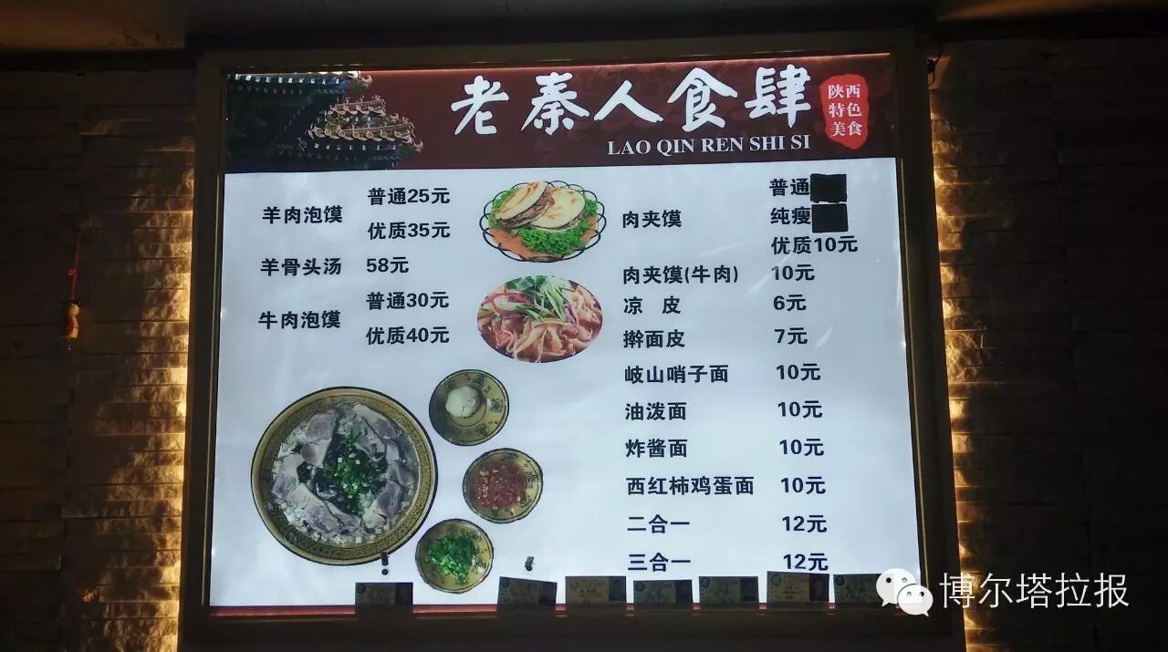 再来说说这吃食,老秦人主打的是羊肉泡馍。这在西安,大街小巷都有,可是在博乐,还真少见,更稀罕的是,老秦人家的泡馍,相当好吃。