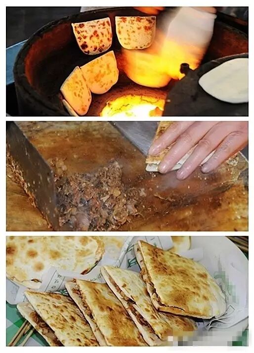 一般的肉夹馍是热馍夹热肉,锅盔牙子则不同,讲究的是热馍夹凉肉!把热馍从侧面仔细划开,夹入经过剁碎的腊汁肉,用馍的热气把肉里油化开,吃起来馍脆肉香、馍和肉相得益彰。