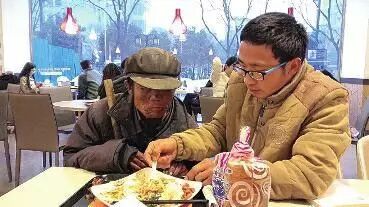 “听完他的话,我的眼泪就出来了,真的很感动。我想到了我过世不久的父亲,他过世前,也是这种半痴呆的状态,我想,有时亲人间都会有不耐心的时候。这个小伙子却能这样对待素不相识的陌生人,太让人感动了。”王老师说,看老人手不灵便,一直在抖,她给老人喂了几口饭,小伙子说:“你赶紧吃吧,我给他喂。”就接过勺子喂起来。