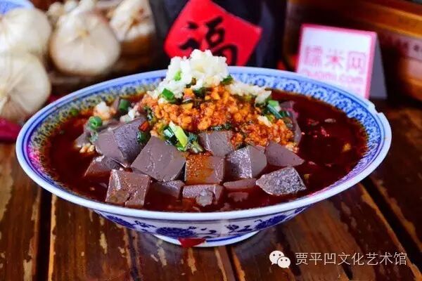 清晨,或是傍晚,食摊安在小巷街头,摆设十分简单,一个木架,架子上是各类碗盏,分别放在盐、酱、醋、蒜水、油泼辣子、香油。木架旁是一火炉,炉上有锅,水开而不翻滚,锅里煮的是切成小方块的羊血。羊血捞在碗里,并无许多汤,加各类调料便可下口了:羊血鲜嫩汤味辣、呛、咸,花椒、小茴香味窜扑鼻。