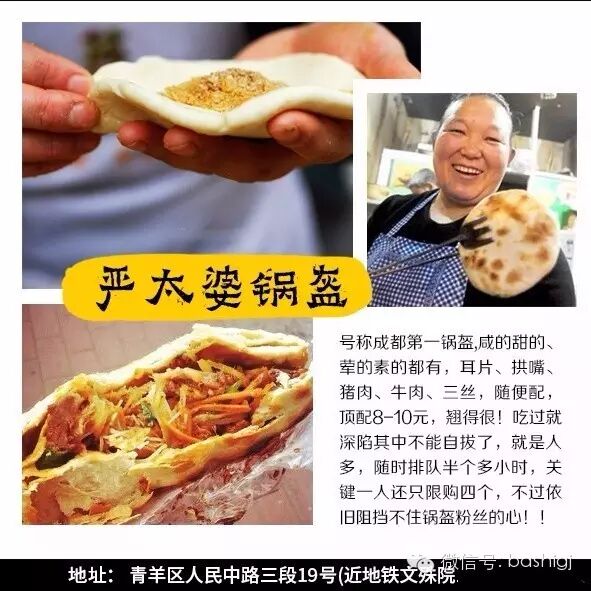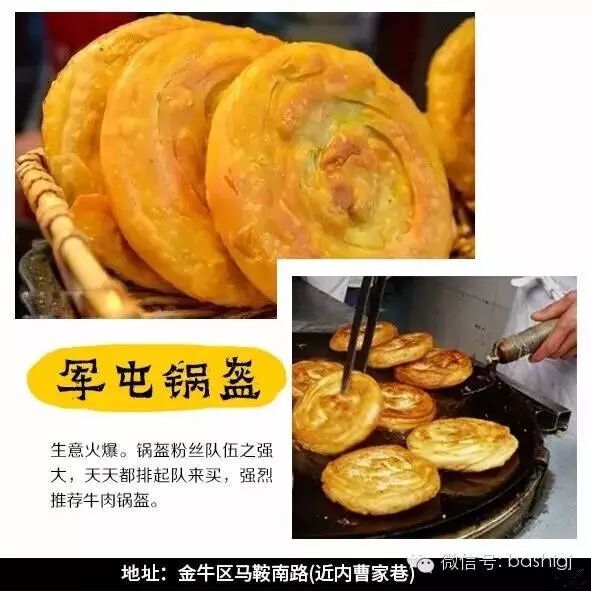 锅盔在成都随处可见。巴小编觉得这是一种最适合有点饿,又不是太饿的时候吃的食物。牛肉、耳片、三丝、红糖……“掐”啥子都好吃!