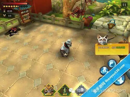 看完了剧情,我们正式进入游戏玩法吧——《功夫熊猫序篇》保持着市面上流行的 ARPG 基本元素,玩家扮演着阿宝(不管你高矮肥瘦,只能扮演胖熊猫,顶多选一件好看点的衣服),推图刷副本、招募其他角色、收集材料养成角色等,操作方法也是常见的“虚拟摇杆+按钮”控制角色跑动和出招(大按钮是普通攻击,小按钮是特殊技能)。