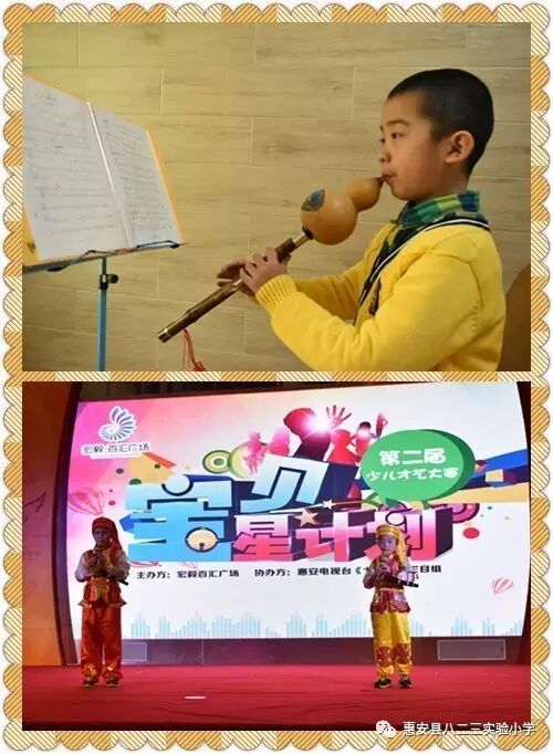 现在我已经通过了葫芦丝六级考试,我也带着我的葫芦丝参加过第二届“宝贝星计划”比赛,“凤之舞”汇报演出。在学校,我参加了艺术节“小小演奏家”比赛荣获二等奖,还同高年级哥哥姐姐们一起参加第五届校园文化艺术节乐器联奏开场表演,这些经历都让我不断成长。