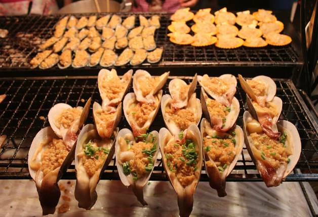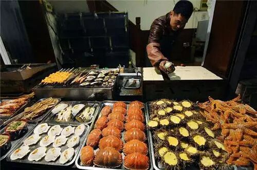 各类海鲜的摊档,店主边吆喝边制作。青岛的美食各式各样,有肉嫩鲜美的海鲜,有诱人可口的甜点,还有香气扑鼻的各式烧烤,每每想起这些美食,不禁总会让人垂涎欲滴。