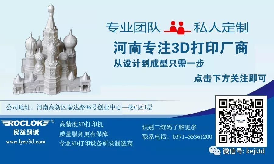 简介: 河南筑诚电子科技有限公司是一家专业提供3D打印整体解决方案的高新技术企业,具有专业的3D打印机研发、生产、销售及售后团队,旗下产品技术先进独特,性能优越稳定。关注良益筑诚,即可免费获取3D打印行业新鲜事!