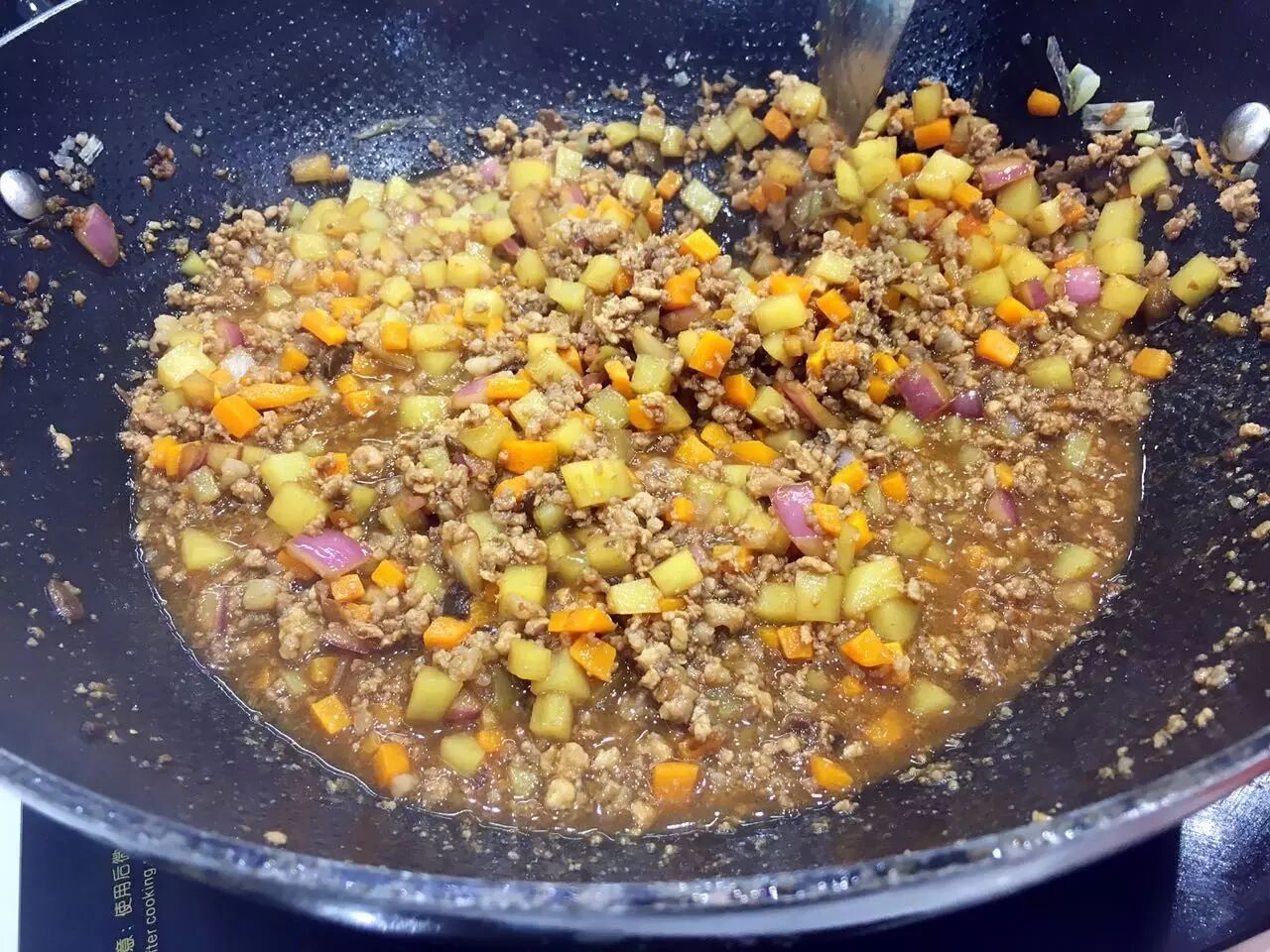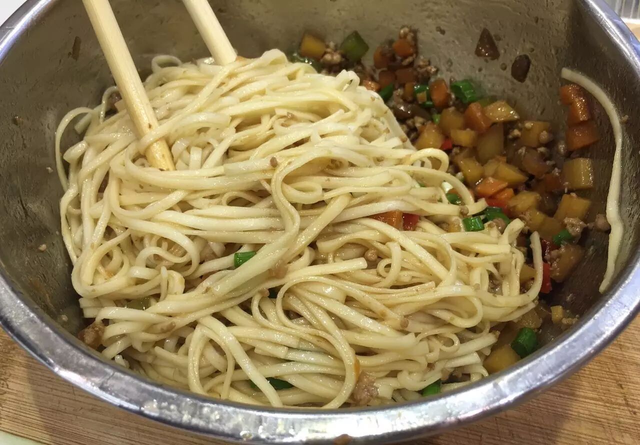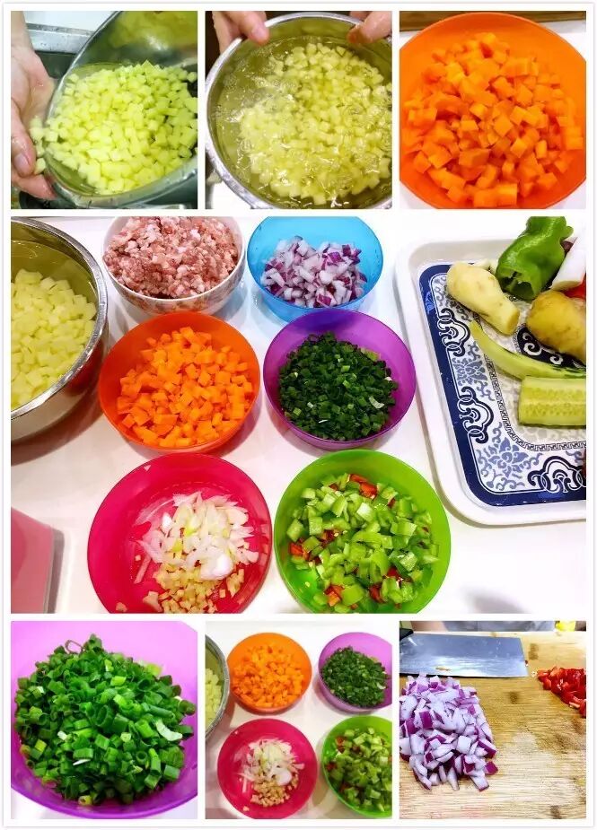 材料:土豆、胡萝卜、洋葱、青椒红椒、大葱小葱、生姜、肉馅、面条