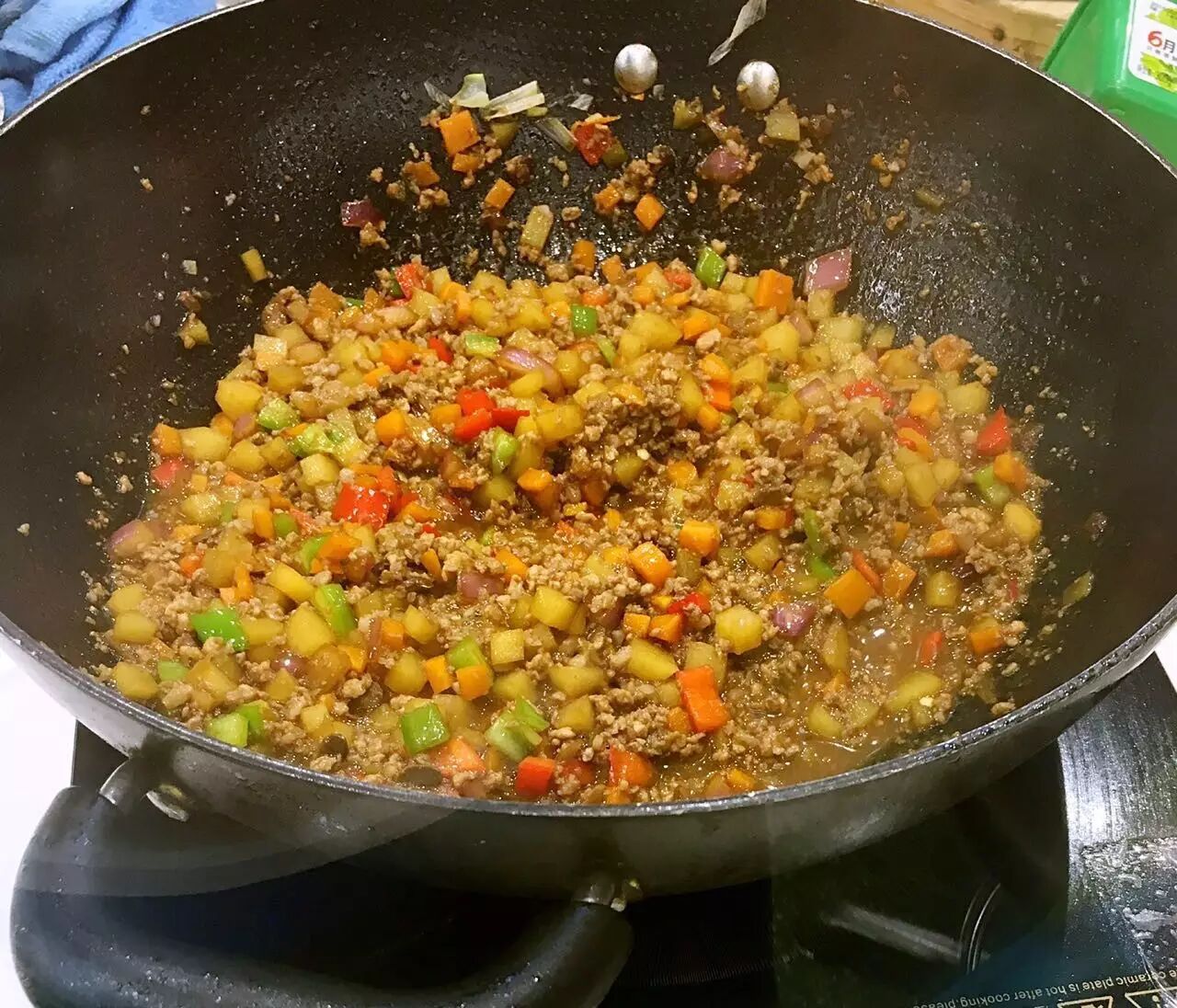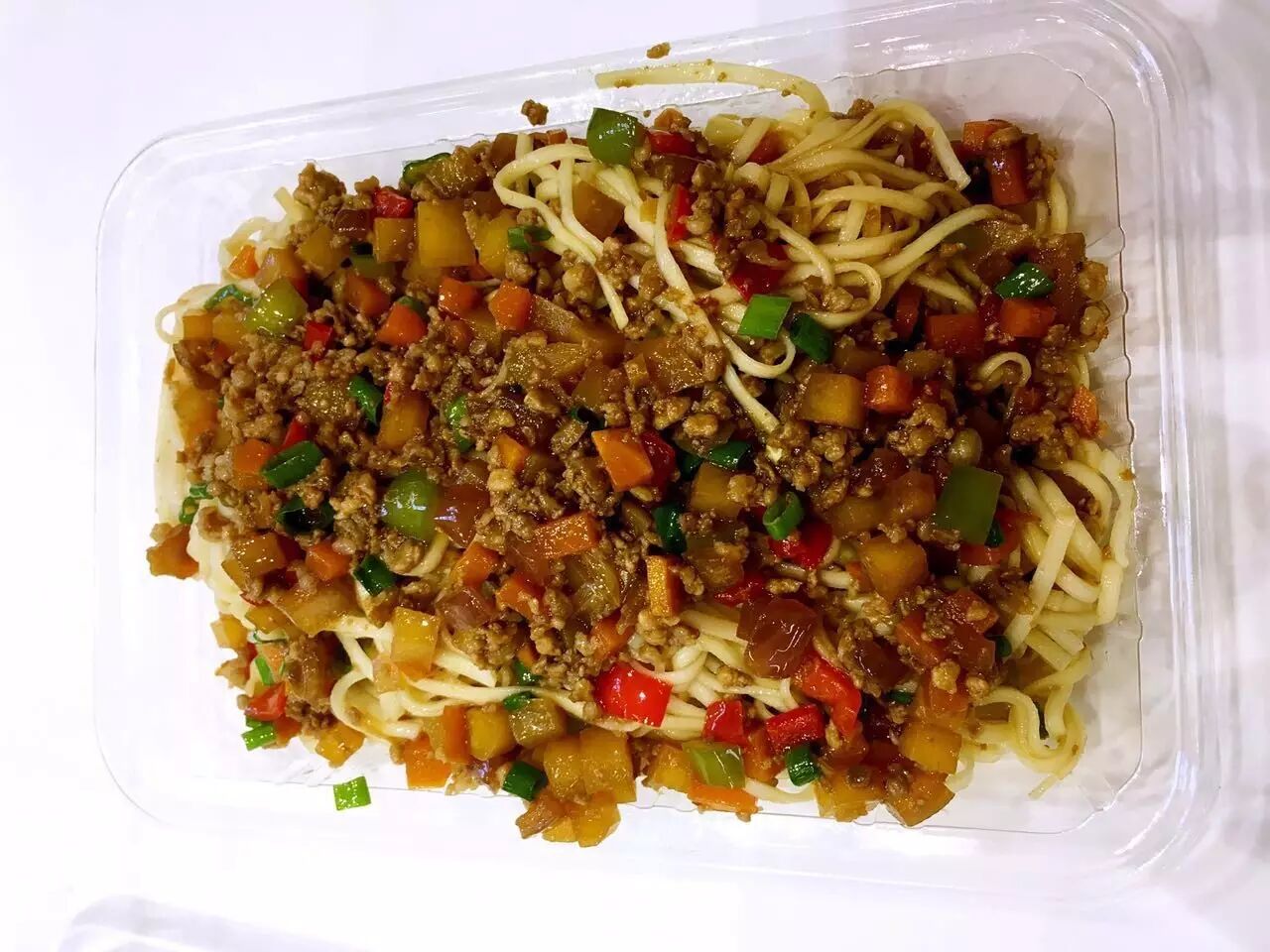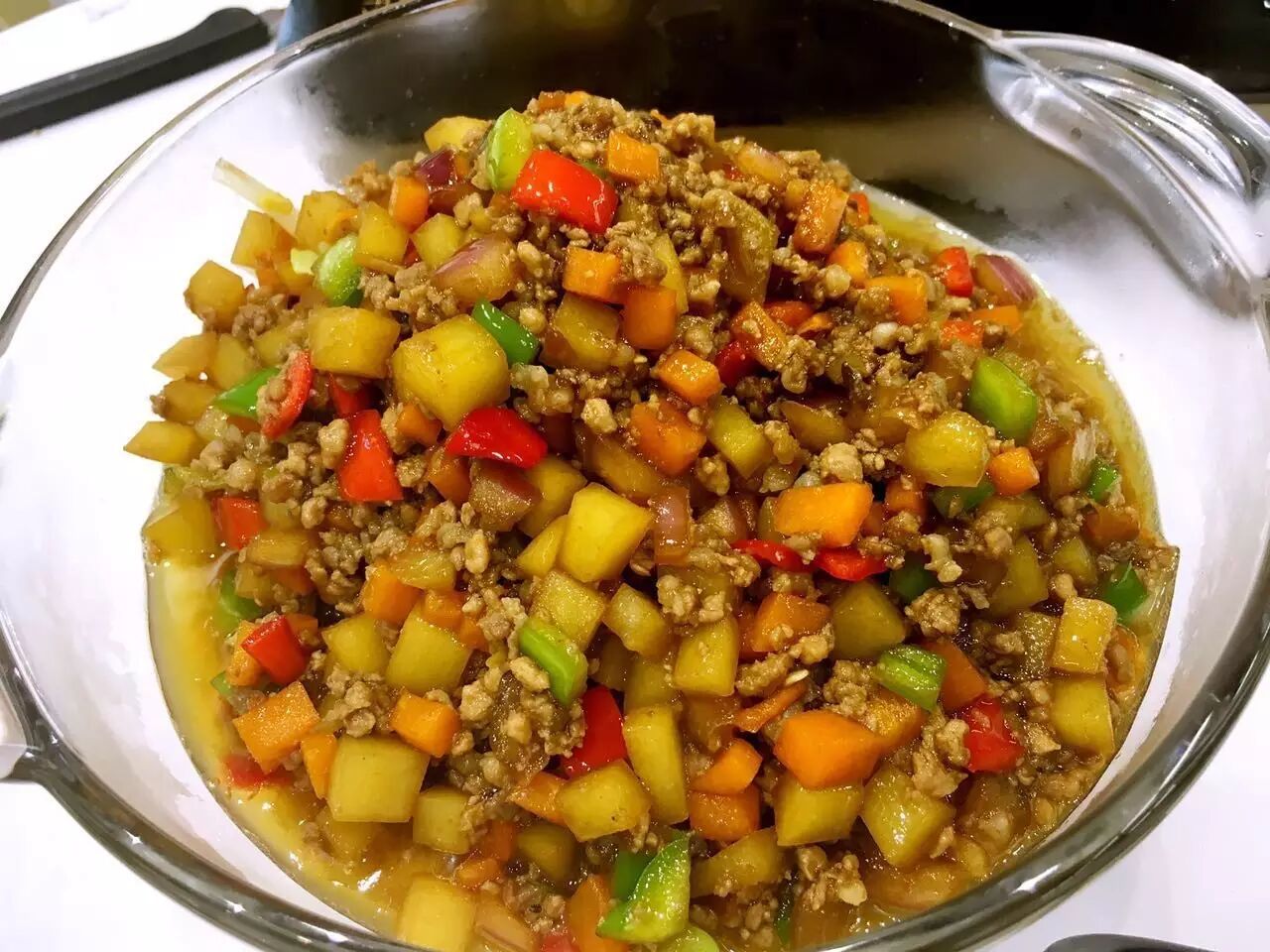 材料:土豆、胡萝卜、洋葱、青椒红椒、大葱小葱、生姜、肉馅、面条