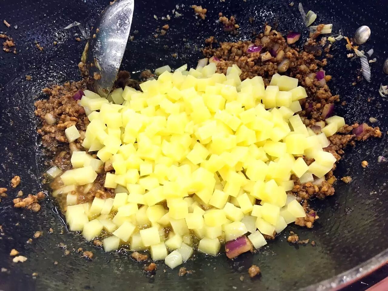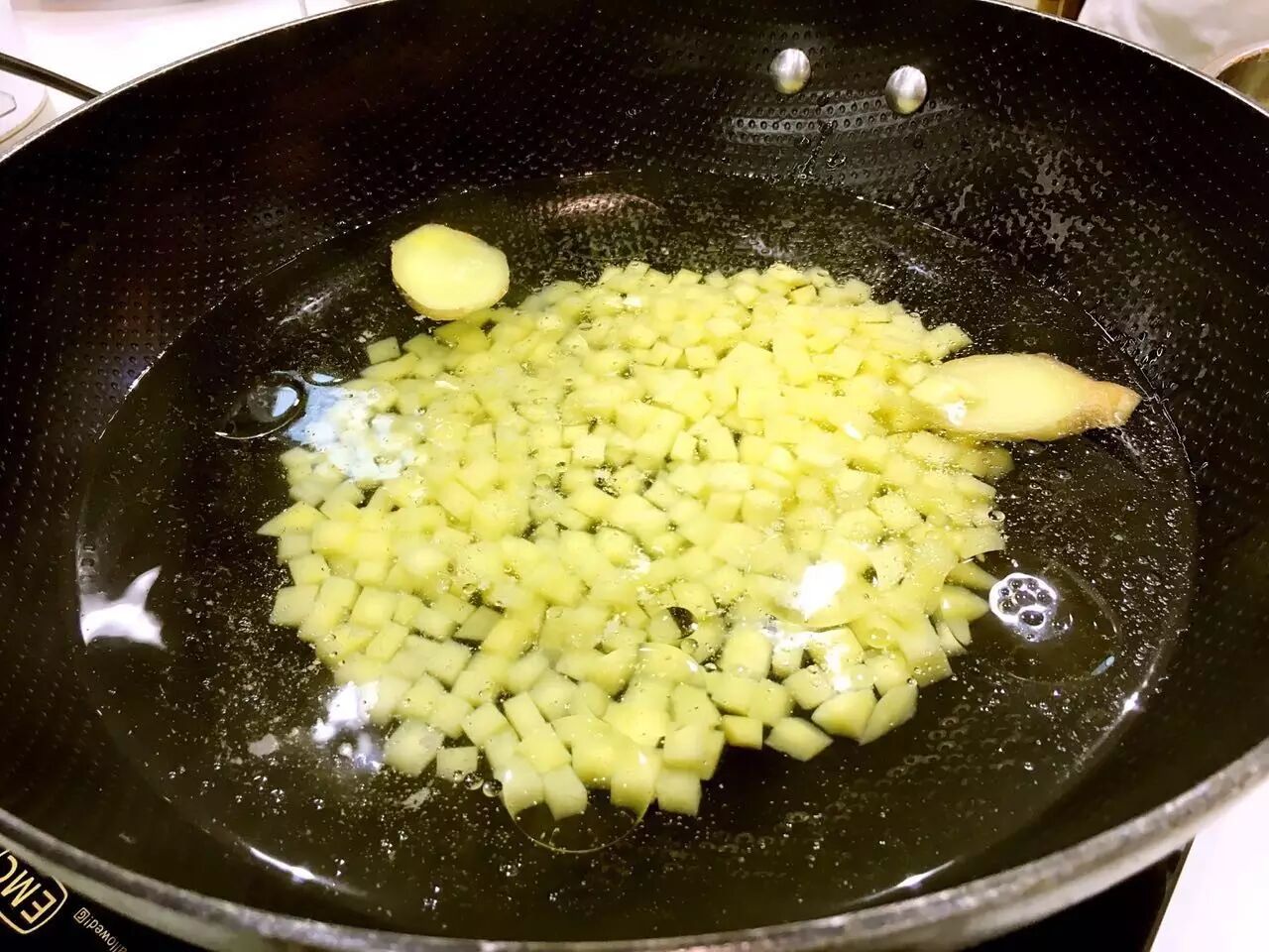 2、将土豆丁焯水,可以略微煮的时间大约3-5分钟,有煮软的感觉