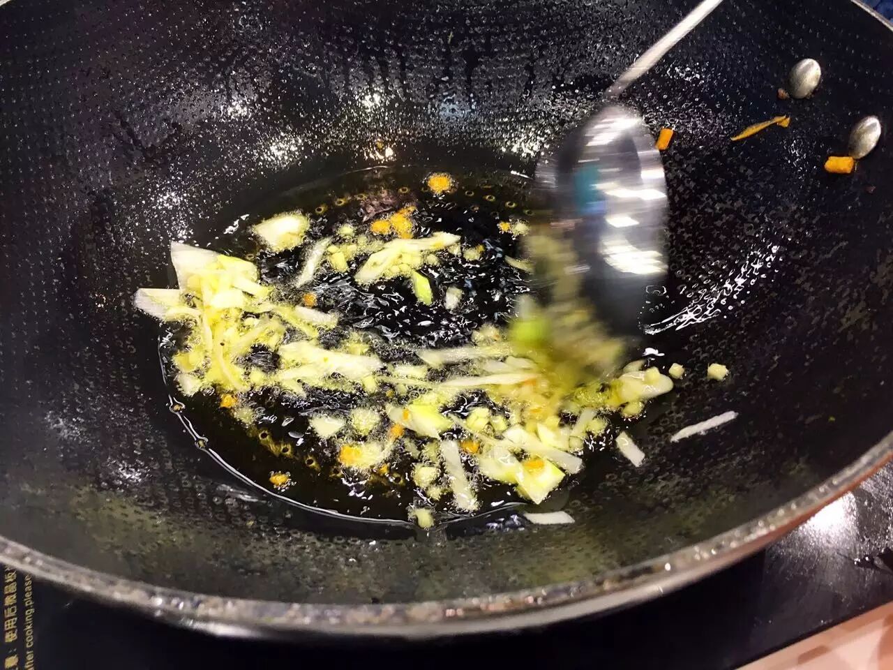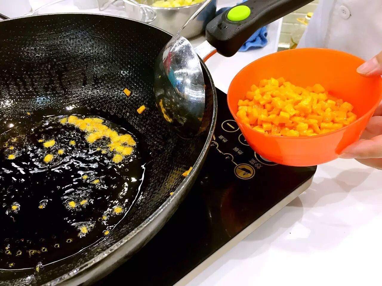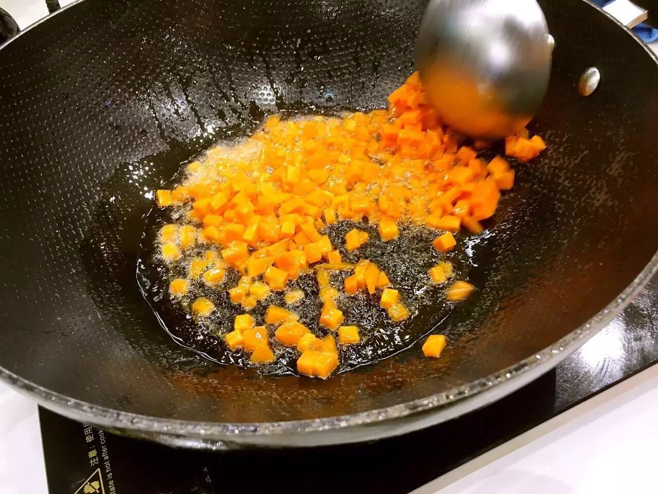 4、倒入油,将胡萝卜丁爆炒,油量可以略微多一些。胡萝卜在经过爆炒后的营养价值比生吃要高很多