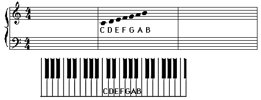 和左面的其他的C在五线谱上面的位置。从中可以看出,在键盘上有规律的C的位置排列到了五线谱上面就没有什么规律可循。换句话说,不同C组的键盘位置在五线谱位置上没有什么联系,你只能通过大量的练习和不断的记忆来逐渐掌握。