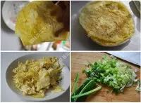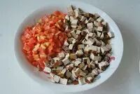 1、胡萝卜切小薄丁(注:是小薄片,不是小方块)、豆腐干切小丁。