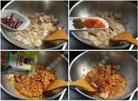 2. 炒至肉片发白后,放入几根干的红辣椒和八角,再放入干辣椒面和五香粉,十三香调味料。适量盐(比平时炒菜稍微多一些,因为臊子要咸点,而且易保存。正宗炒好的肉臊子放最少半年都不会坏。)继续小火慢慢炒。