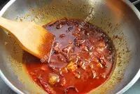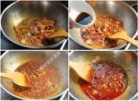 3. 炒至肥肉吐油、各种香料的香味完全激发出来。火开大,倒入醋(醋一定要多!肉和醋的比例一般为2:1,即一斤肉半斤醋的比例,受不了酸的童鞋可以酌减)。然后小火慢煮,盖上盖子煮10分钟左右,让其入味。煮至汤汁浓稠,辣椒面和各种调料面的香味和肉片出的油香完全合二为一,肉臊子基本上就“揽”好了。(陕西人一般把炒肉臊子不放水的方法叫做“揽”)