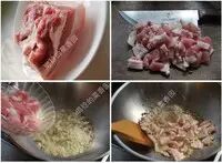 选精五花肉,洗净,连皮切成1cm见方的小片,给锅里放上油,油热后放入葱丝、姜丝煸出香味,放入肉片(最好先放肥肉,待肥肉炒至肉皮发亮,开始吐油时,放入瘦肉一起炒),改小火,不停的煸炒肉片。