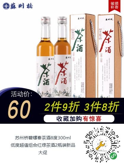 【酒】老字号苏州桥碧螺春茶酒,8度,300ml*2瓶,之前它家的米露很多群友喜欢。这个使用碧螺春为原料发酵酿制的酒,除了酒香还有茶香。15券后45元,一瓶22.5,感兴趣的可以一试。