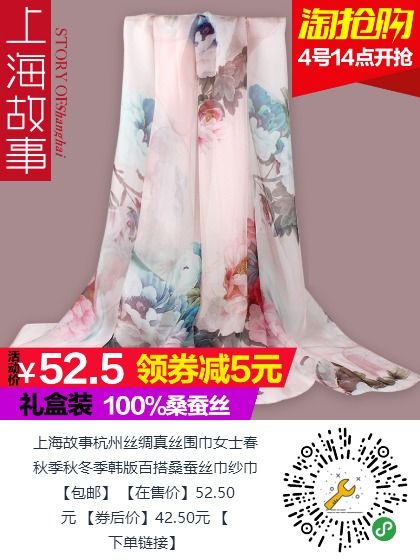 【限时】优惠截止14:00。上海故事真丝围巾。选用杭州6A级桑蚕丝。桑蚕丝100%。券后淘抢购降10元,42.5元。这家可以。需要的自己选选啦。