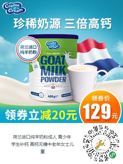 【食材】【高端】荷兰原装进口无糖全脂高钙羊奶粉。券后降30元,119元包邮包税。羊奶粉三倍高钙,营养价值比牛奶粉高很多,价格也比进口的牛奶粉贵多了,各位需要品质奶粉的,可以上。