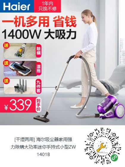 【过年扫除】海尔家用强力吸尘器,无耗材,干湿两用,送除螨刷。80券后259元。老式吸尘器的缺点当然是老派,优点是吸力大和质量可靠。