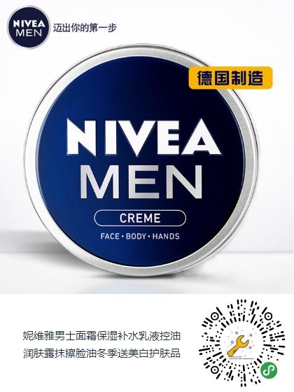 德国原装进口Nivea妮维雅经典款男士润肤霜50ml。券后降15元,29.9元。送精华露10g,面膜1片。
