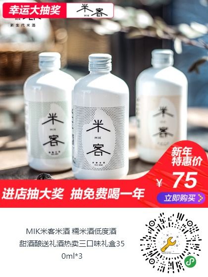 MIK米客甜酒酿糯米酒350ml*3瓶精美礼盒装。酒精度6度,传统工艺酿造。MIK在上海的餐饮店随处可见,被业界称为“颠覆了米酒行业的第一品牌”。券后降30元,45元。京东自营75元。这个季节温壶米酒,滋儿喽一口酒,吧嗒一口菜,美好。男女都可享用,小酌怡情。