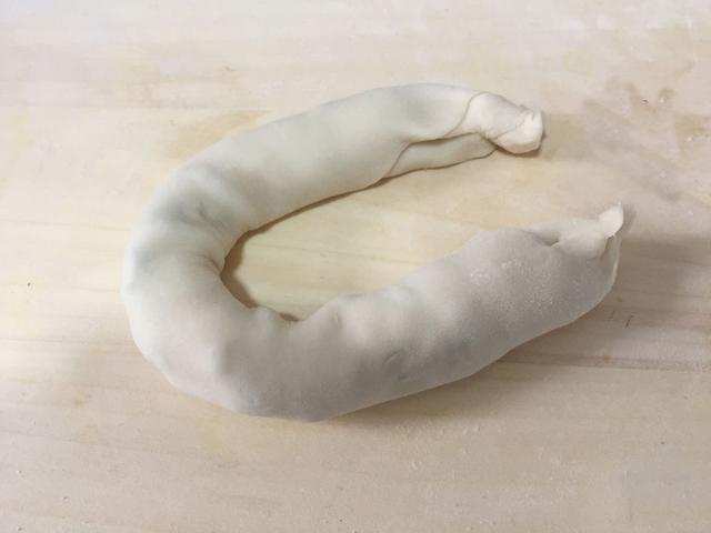 6. 再擀开成大面片,擀薄一些,擀的时候用力均匀。