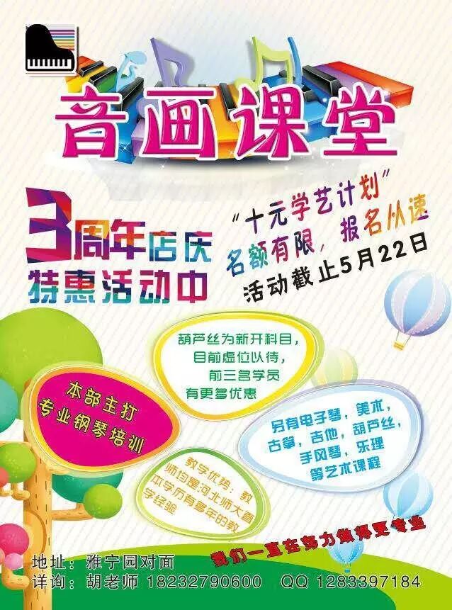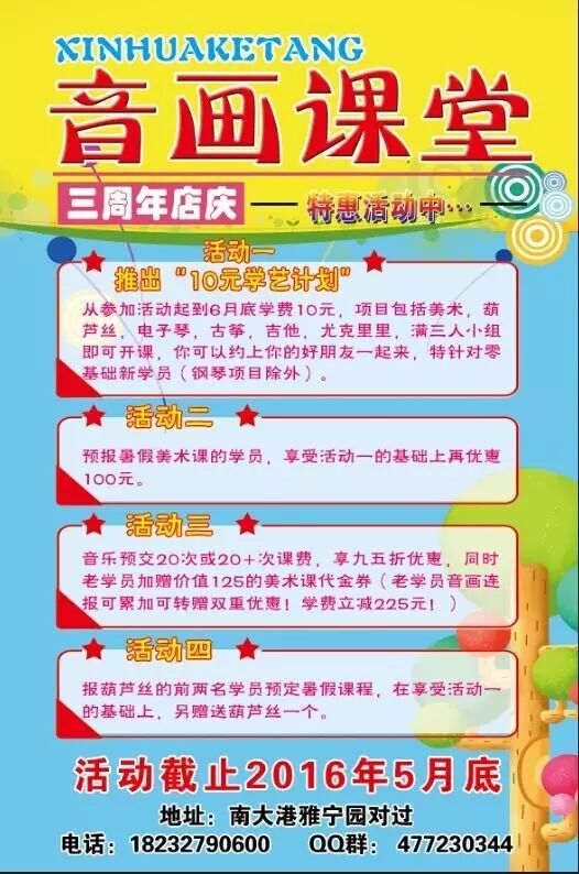 “音画课堂”艺术培训,三周年店庆活动中,近期推出“10元学艺计划”欢迎新同学的加入,地址:南大港雅宁园对面音画课堂,电话:18232790600,QQ:1283397184