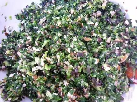 制作方法:青菜洗净入开水锅烫一下,和洗净的木耳、香菇、笋一起切碎,挤去多余水分,加盐、鸡精、糖和麻油调好口味。
